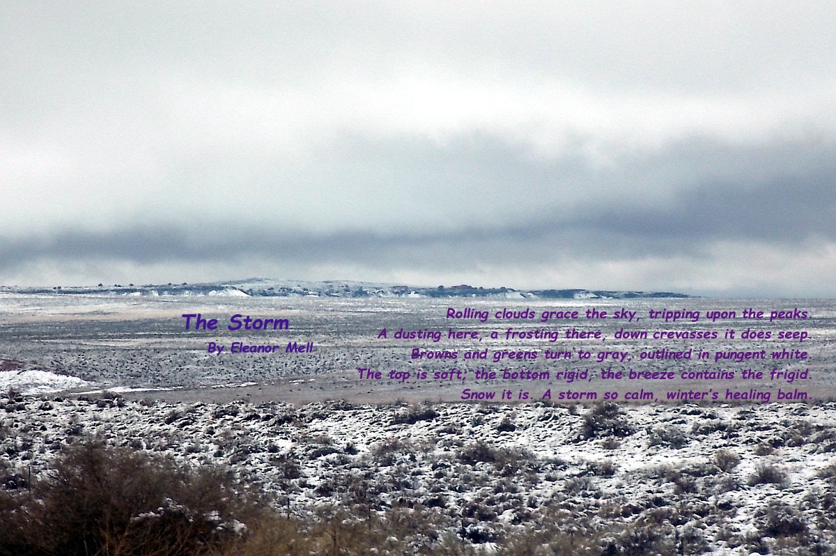 I wrote this poem in 2007, while watching a winter storm blow in from the comfort of my second floor room at the YMCA of the Rockies. The photograph is one I captured on our return trip from Colorado in April 2013. It was snowing in several spots along the way, but this is from southbound Interstate 25 near Walsenburg, Colorado. Those are the Spanish Peaks on the horizon.