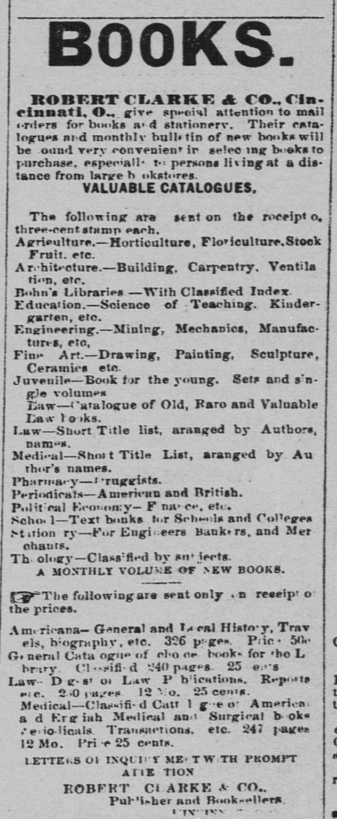Are you an avid reader? Check out Robert Clarke & Company of Cincinnati, Ohio. Their “valuable catalogues” are ideal for those living way out West. Besides, they “give special attention to mail orders…”