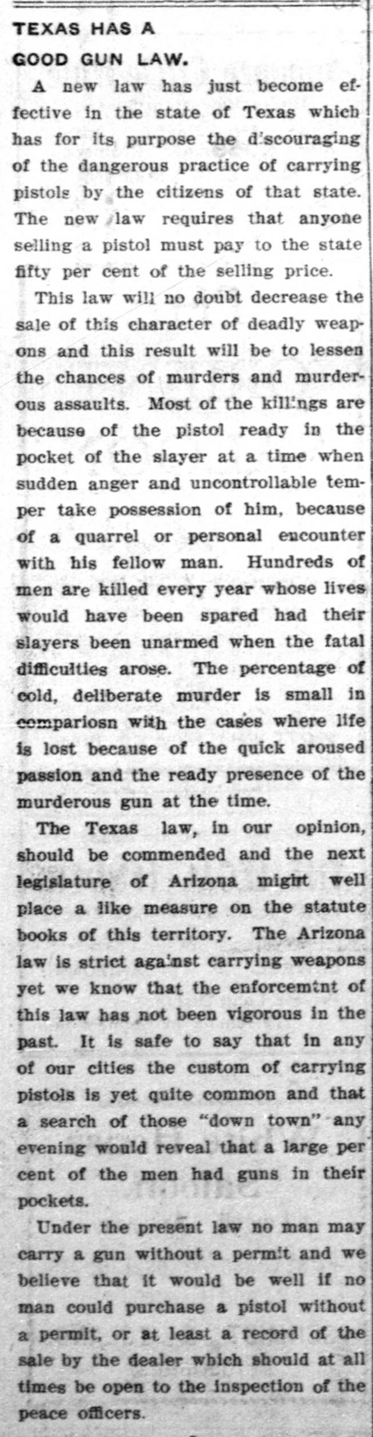 An editorial in the Bisbee Daily Review, entitled “Texas Has a Good Gun Law,” caught my eye on page 4 of the Friday Morning Edition of August 16, 1907. The Editor talks about a law that will “no doubt decrease the sale of this character of deadly weapons and this result will be to lessen the chances of murders and murderous assaults.”