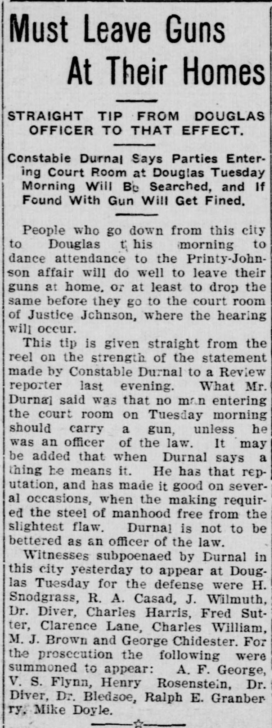 The first article comes from the Bisbee Daily Review, Tuesday Morning Edition on September 6, 1904, headlined “Must Leave Guns At Their Homes.” Constable Durnal will not allow guns in Justice Johnson’s court room. “What Mr. Durnal said was that no man entering the court room on Tuesday morning should carry a gun, unless he is an officer of the law.” Beware if you have a side arm, “It may be added that when Durnal says a thing he means it.”